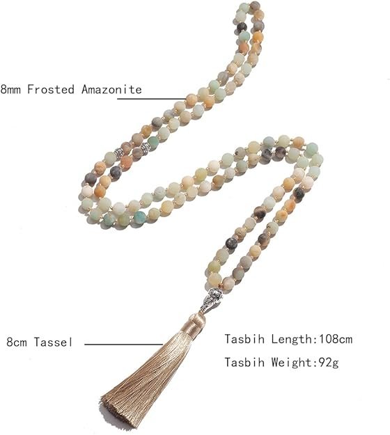 This jewelry is made of 99 matte amazonite stones, the stones are natural, so each bead will be a little different in size and color, but after our selection these errors are minimal. Each bead is separated from each other with a knot and every 33 beads are separated by a metal bead. This jewelry can be used as a necklace or as a bracelet, you can hold it in your hand when you pray!