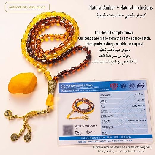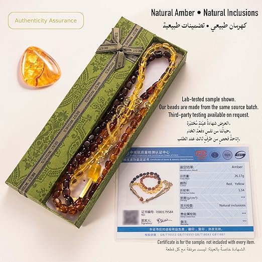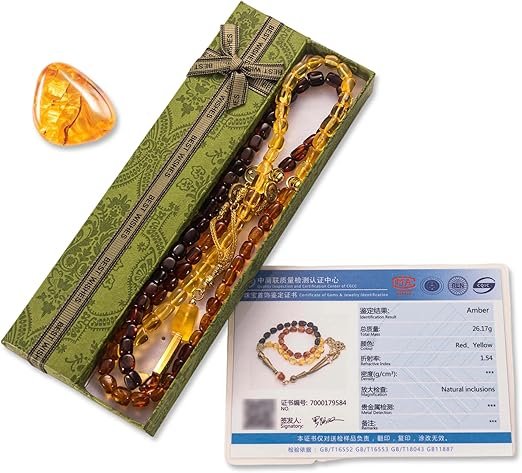 Handcrafted 33-bead Baltic Amber tasbih with polished multicolor stones. Ideal for daily dhikr, meditation, and gifting for Ramadan, Eid, or birthdays.
