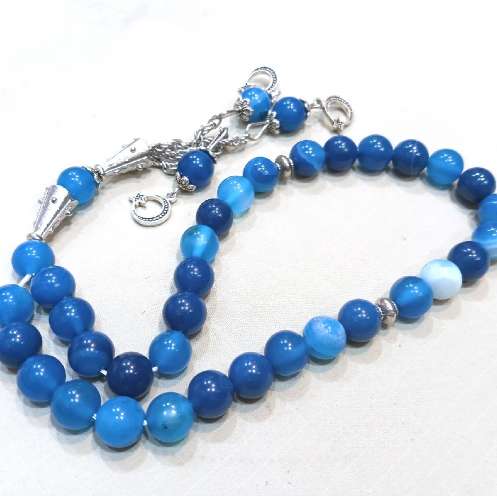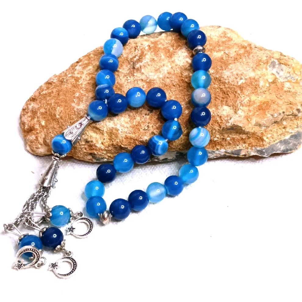 Elegant Blue Striped Agate Tasbeeh – Natural Stone Prayer Beads