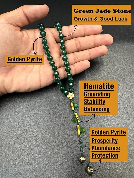 This beautifully crafted tasbih is made for those seeking a deeper sense of peace, clarity, and spiritual grounding. The natural Green Jade beads work harmoniously to boost calmness and sharpen focus, creating a soothing rhythm during every prayer or meditation session. Its thoughtfully selected healing crystal combination helps enhance the quality of Zikr, allowing the mind to stay centered and connected. Golden Pyrite accents add a layer of protection and attract uplifting energy, making the tasbih not just a prayer accessory but a meaningful spiritual tool. Whether used for daily devotion, mindfulness practices, or carrying positive intentions throughout the day, this tasbih brings together protection, good energy, and emotional balance in one elegant design, supporting your journey toward inner harmony and spiritual well-being.