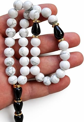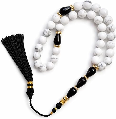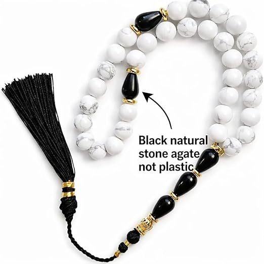 Elevate your daily moments with these luxury prayer beads, crafted from natural white howlite stones and accented with polished black onyx details. Each bead is carefully selected for its smooth finish and refined marble-like veining, creating a timeless balance of purity, contrast, and sophistication. The design is enhanced with elegant gold-tone spacers and a silky black tassel, adding a subtle touch of prestige while maintaining a classic Islamic aesthetic. Cool to the touch and comfortable in hand, these prayer beads offer a refined tactile experience, ideal for daily use or meaningful gifting. Handcrafted with attention to detail, this premium tasbih reflects understated luxury, making it a distinguished accessory for men who appreciate quality, tradition, and modern elegance.