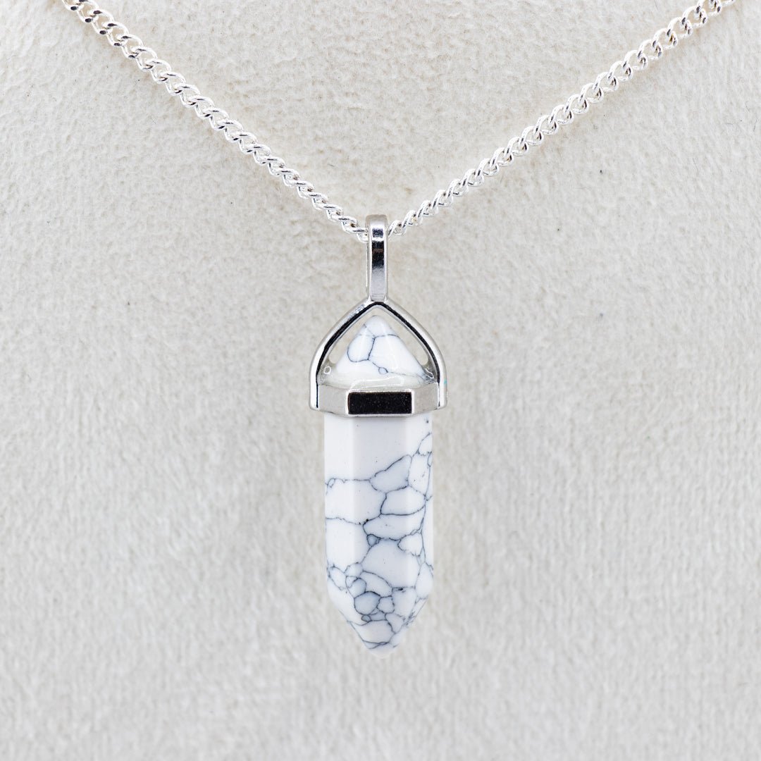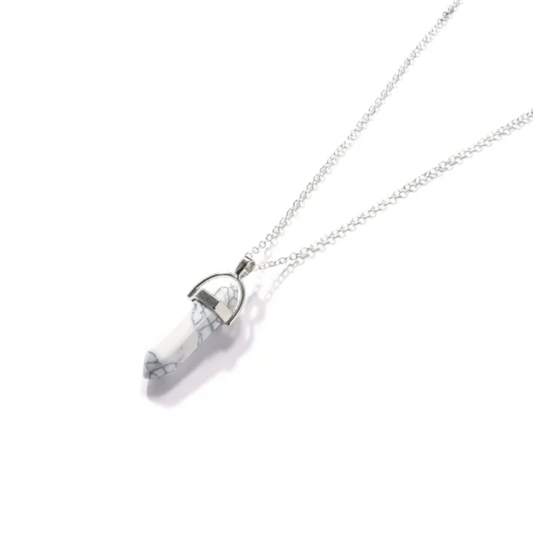 Bring peace and style together with this beautiful Howlite pendant. Known for its calming energy, the natural white stone with delicate gray veins adds a touch of sophistication to any outfit. Perfect for everyday wear or as a meaningful gift.