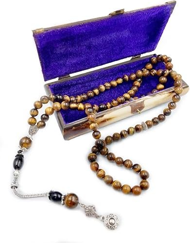 Experience the elegance of handcrafted devotion with our premium Tiger Eye Tasbih, beautifully presented in a luxurious velvet-lined gift box. Each bead is carved from natural Tiger Eye gemstone, known for its grounding energy, golden-brown shine, and ability to enhance focus during prayer and meditation. The smooth, polished beads glide effortlessly between the fingers, offering a calming and rhythmic dhikr experience. Enhanced with a detailed silver tassel, this Tasbih combines traditional craftsmanship with modern refinement. The premium gift box not only protects your Misbaha but also makes it a perfect choice for gifting on religious occasions, personal milestones, or as a cherished keepsake. Designed for durability, elegance, and spiritual connection, this Tasbih brings beauty and meaning to every prayer.