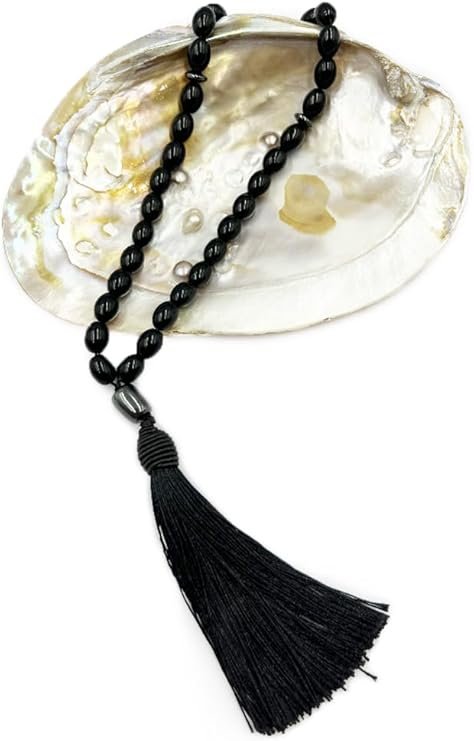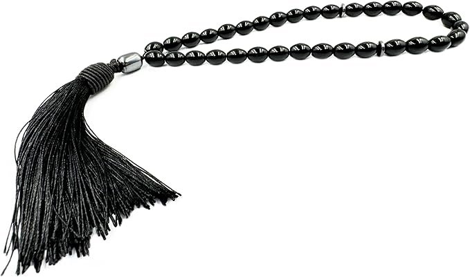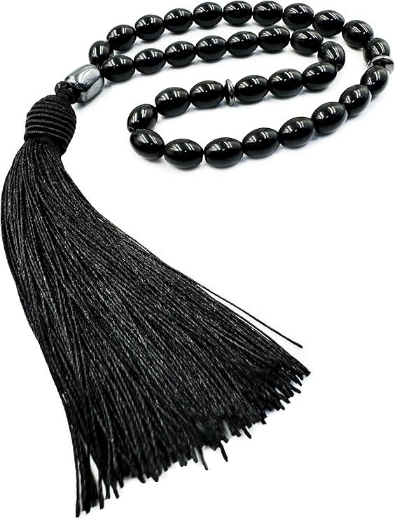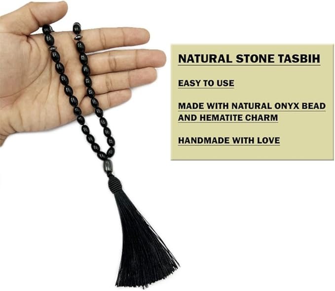 Natural Black Onyx Stone Tasbih crafted with smooth, polished beads for comfortable dhikr and daily prayers. Designed with a stylish hematite charm for grounding and balance, it offers durability and an elegant spiritual look. A meaningful Islamic gift for Ramadan, weddings, or personal meditation and worship.