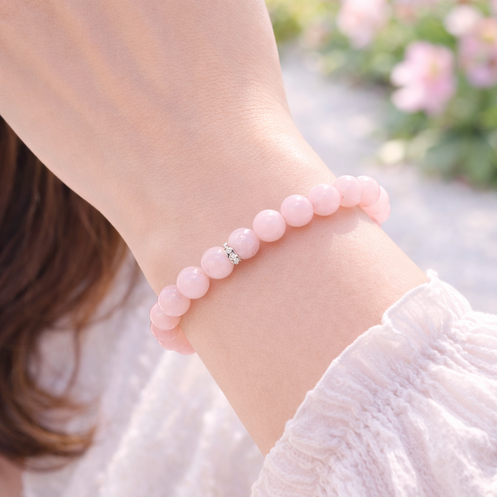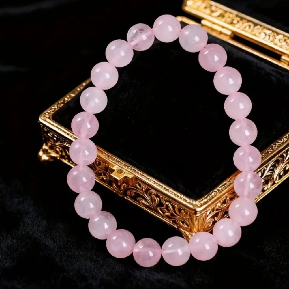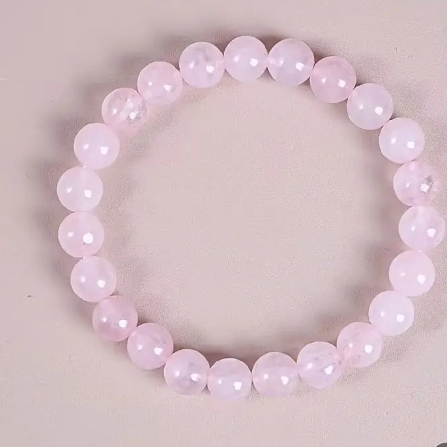 A delicate bracelet featuring soft pink rose quartz beads with a smooth, polished finish. Elegant and timeless, it adds a gentle touch of beauty to any outfit—perfect for everyday wear or gifting.Due to the natural origin of the stone, slight variations in color and pattern may occur.
