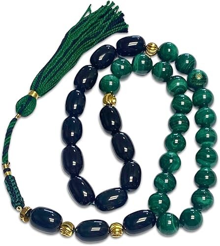 Exclusively designed by Miracle Empire LLC, TM Co. This misbaha man prayer bead was handcrafted with the best quality of materials and natural clean Malachite and Obsedian stones. Although our stones/crystals are imported from across the world, we carefully select and handmake -stone by stone – each of our products in UAE specially for you. BE AWARE that we understand the importance of keeping the stone’s energy clean, pure, full, and untouched; therefore, we only make the product when it is purchased. Malachite is considered the stone of transformation and change. One of the most life-changing stones. Malachites are known to vibrate deeper to the core of a problem, enhancing intuition and insight. It is believed to alleviate mental disturbances, including psychiatric illness, and combats dyslexia. It is believed to help strengthen the ability to absorb and process information, makes you more observant. and helps in understanding difficult concepts. Obsidian is often considered a grounding stone, helping individuals connect with the Earth’s energies. It is believed to provide a protective shield against negative energies and psychic attacks. Obsidian is thought to enhance self-reflection and provide insight into one’s thoughts and behaviors. It is believed to bring hidden issues to the surface, encouraging personal growth and self-awareness. This Masbaha is packed in a beautiful, elegant box exclusive of Miracle Empire, wrapped around with a classy bow. It contains a velvet cushion, a velvet jewellery pouch for the tasbih protection and jewellery care cards. You will be very pleasantly surprised and love it as this is our main goal, for you to feel special when opening our product. Packed ready for a gift.
