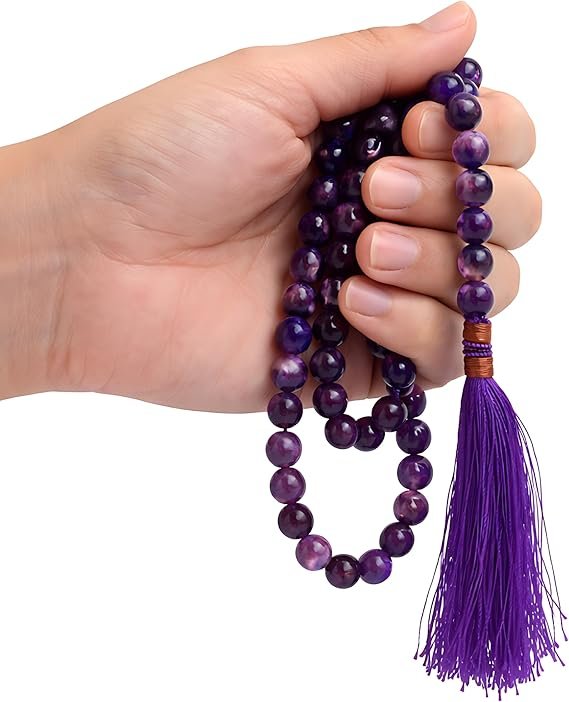 Handcrafted 99-Bead Purple Agate Tasbeeh with smooth 8mm natural stone beads. Ideal for daily zikr, dhikr, and prayer, comes with an elegant gift pouch—perfect for personal use or as a meaningful Islamic gift.