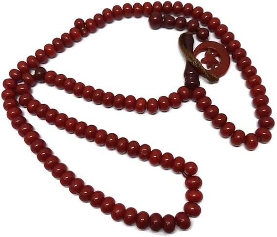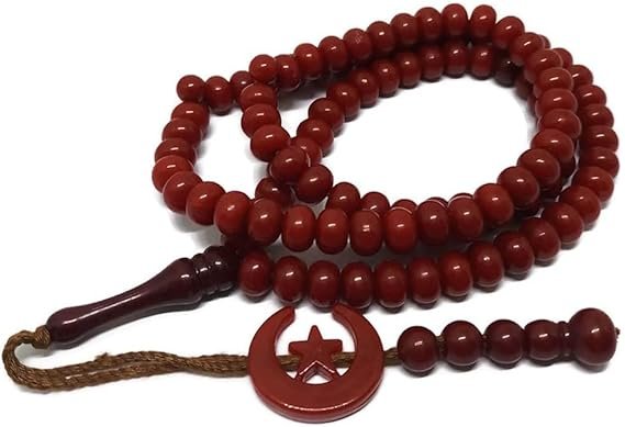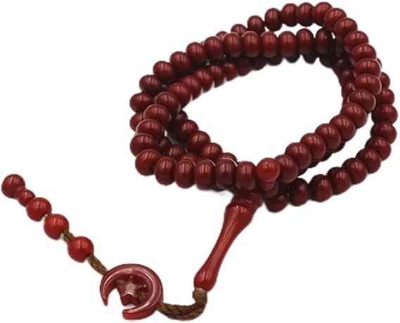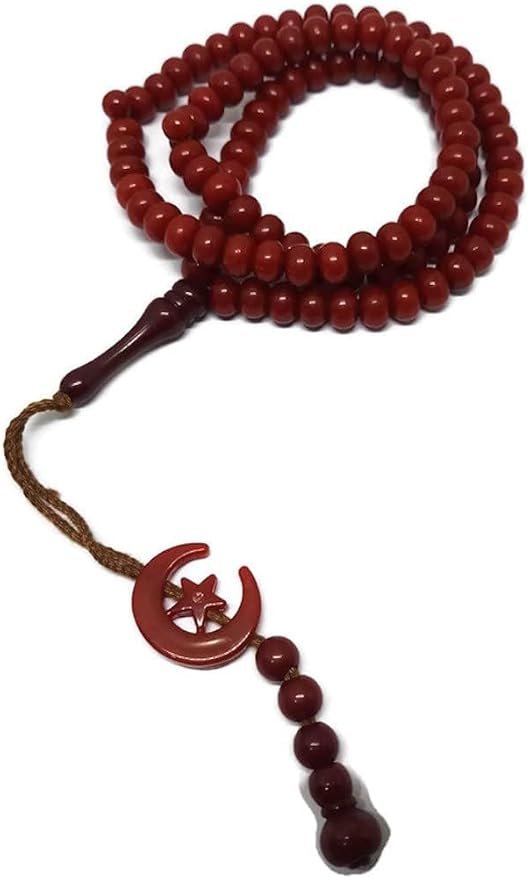 Red 99-bead Islamic tasbih with 8mm smooth beads and moon-star tassel. Perfect for dhikr and gifting for Hajj, Eid, and Ramadan.
